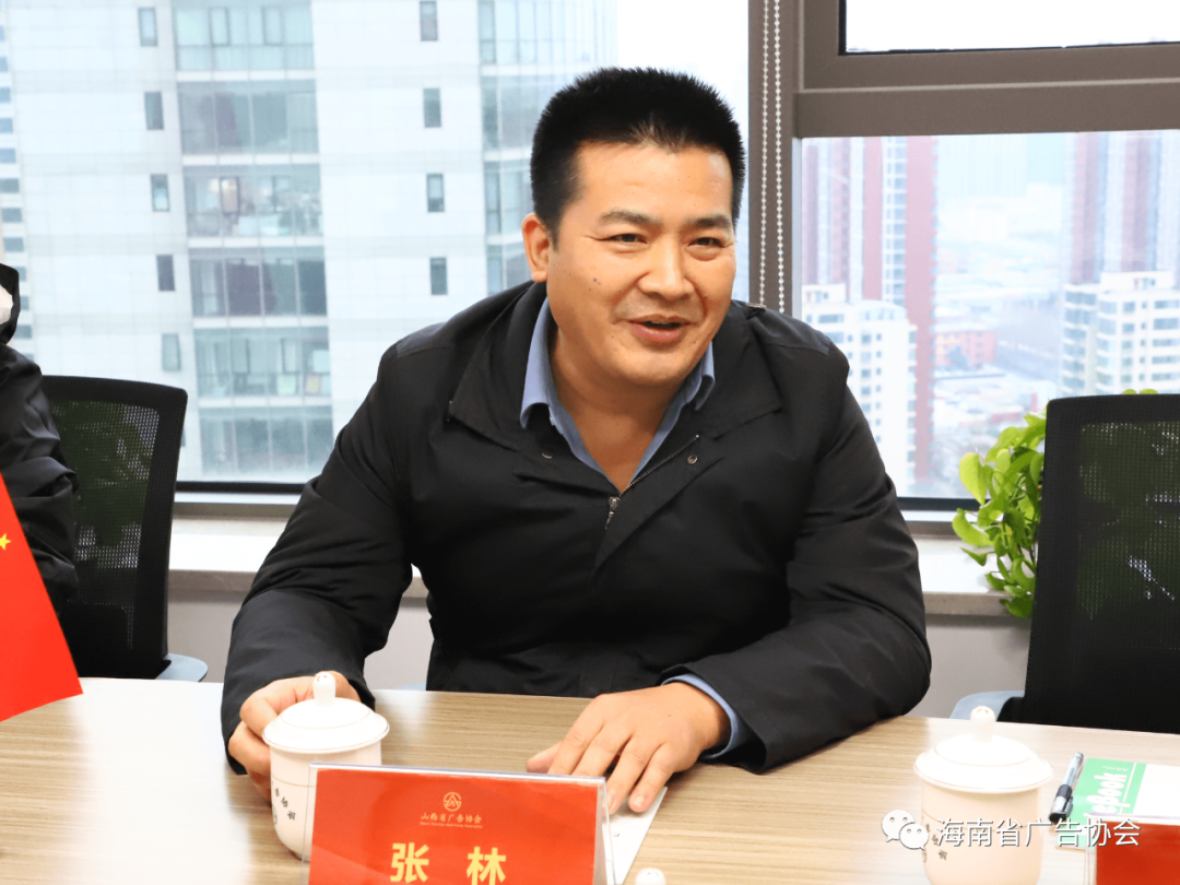 秘书长张林也对此次山西省广协的热情接待表示感谢,海南省广告协会近几年来乘势而上,在推动行业发展方面积极探索新模式,特别在今年疫情防控政策调整后第一年,围绕更好服务会员、更好服务经济发展,更好服务自贸港建设等推出新的举措。山西省与海南省广告业的发展有很多相似之处,在环境与资源优势等方面互补性很强,双方协会一直友好合作,我们早有意愿到山西省广协交流学习,特别是了解到山西集智新城数字文化产业园的建设很有特色,这次专程来协会调研和交流。